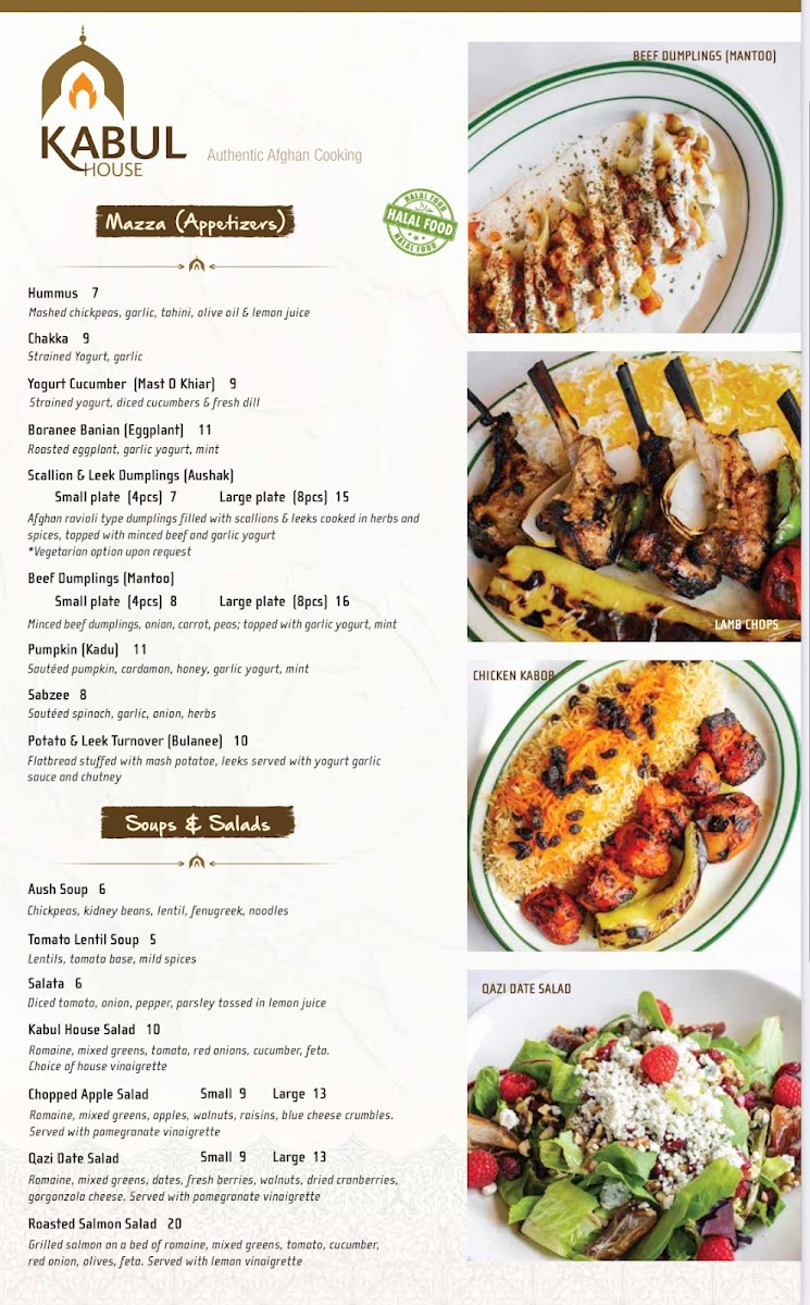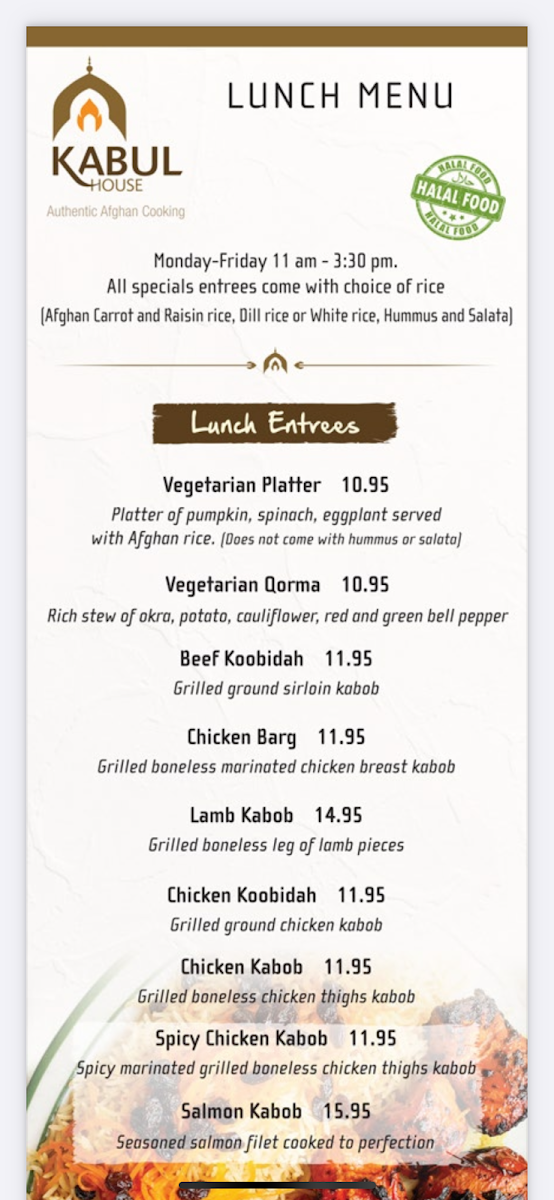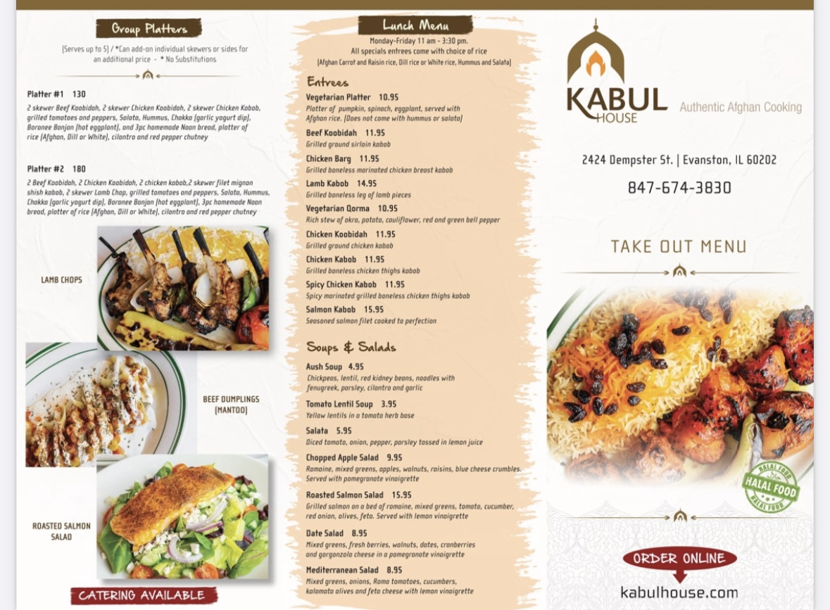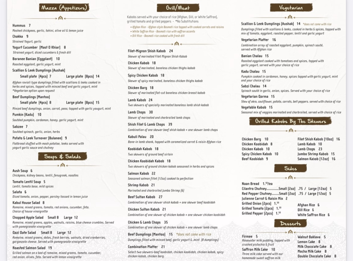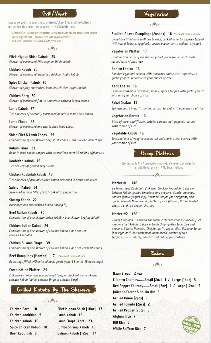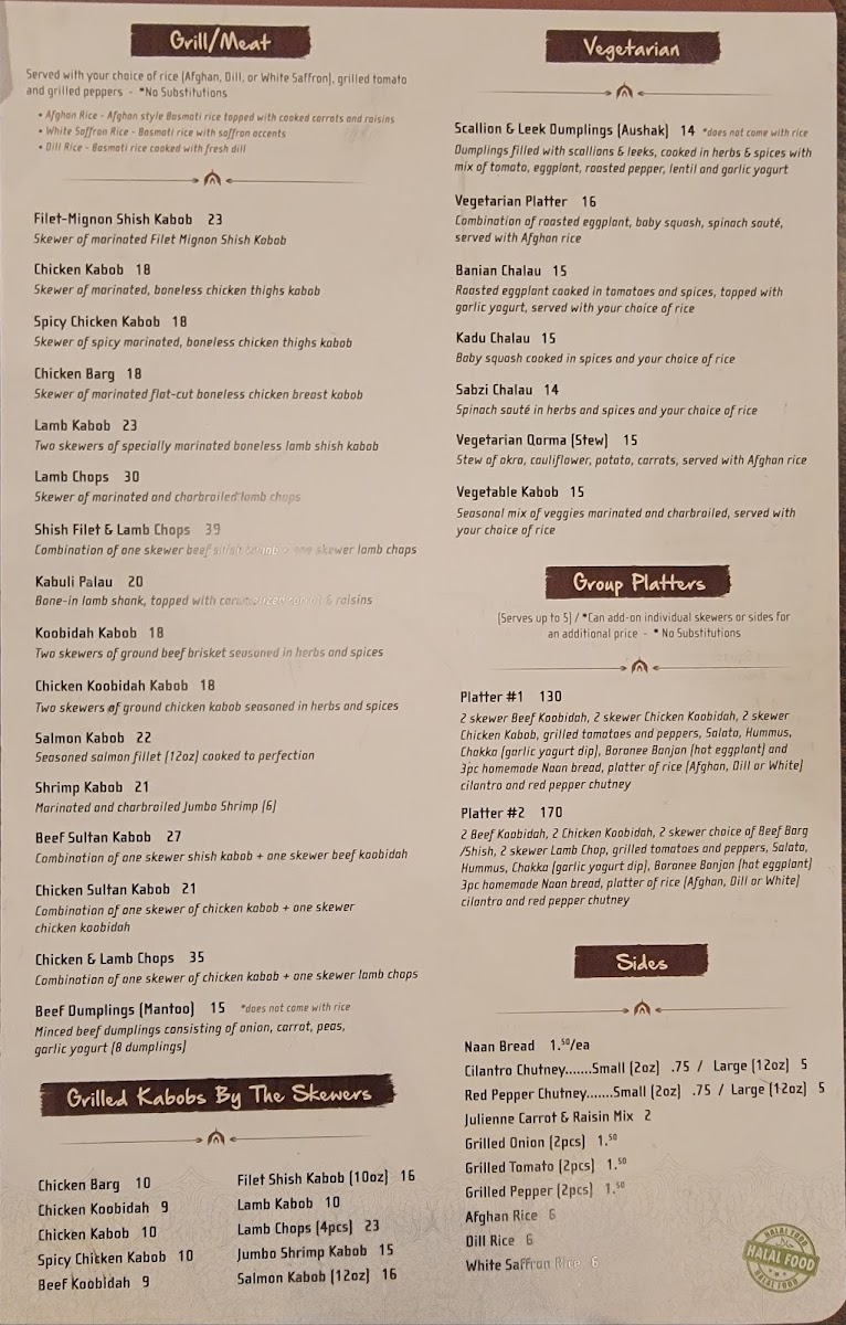 2 skewer beef koobidah, 2 skewer chicken koobidah, 2 skewer chicken kabob, grilled tomatoes and peppers, salata, hummus, chakka (garlic yogurt dip), boranee banjan (hot eggplant) and 3 pieces homemade naan bread, platter of rice (Afghan, dill or white) cil